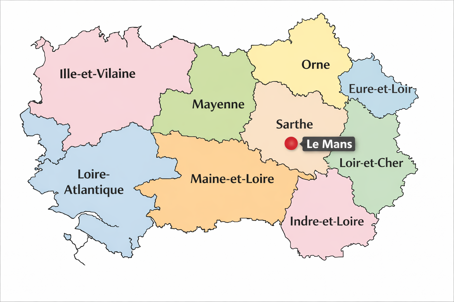 Implantés au Mans, nous intervenons dans l’ensemble du Grand Ouest : Sarthe, Mayenne, Maine-et-Loire, Orne, Ille-et-Vilaine, Loire-et-Cher, Eure-et-Loire, Indre-et-Loire et Loire-Atlantique.